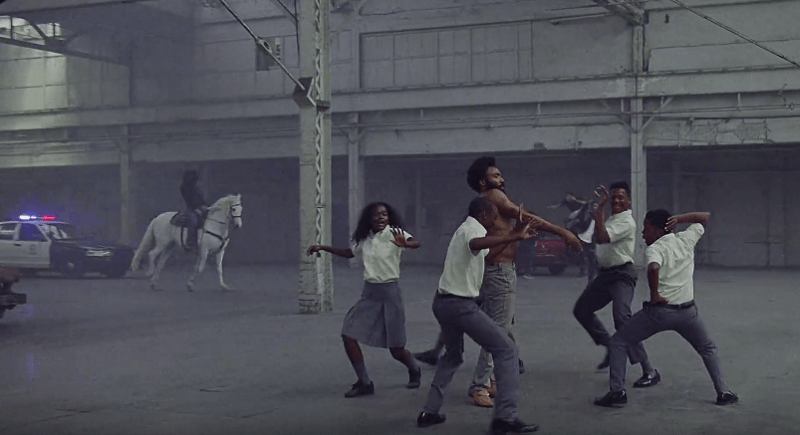 Gambino is the focal point throughout almost the entirety of the music video, but the background is where the point of it all becomes clear. Intentionally obscured is a smorgasbord of utter insanity as police riots, black youth shooting money guns atop middle class cars, a masked man riding a white horse, and the sounds of violent protestation. Through it all, director and Atlanta collaborator Hiro Murai makes sure the song and its star are the focus. Shit is going down (including a possible allusion to the 2015 Charleston church shooting), but at least we have a catchy tune to distract us for a while until it all blows over… right?